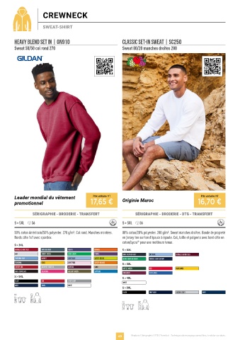 50% coton Américain/50% polyester. 270 g/m2. Col rond. Manches montées. 80% coton/20% polyester. 280 g/m2. Sweat manches droites. Bande de propreté