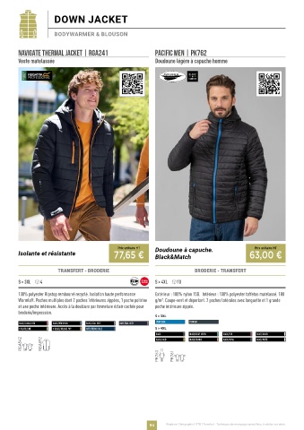 100% polyester Ripstop rembourré recyclé. Isolation haute performance Extérieur : 100% nylon 15D. Intérieur : 100% polyester taffetas matelassé. 180