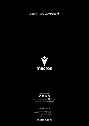 Follow us on and on our Instagram channels @macron - @macronfootball MACRON S.p.A. Via Giulio Pastore 57 40053 Valsamoggia (BO) Italy T: (+39) 051 6720077 info@macron.com macron.com