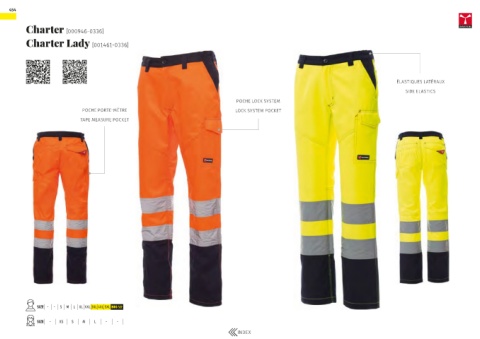 454 Charter [000946-0336] Charter Lady [001461-0336] ÉLASTIQUES LATÉRAUX SIDE ELASTICS POCHE LOCK SYSTEM POCHE PORTE-MÈTRE LOCK SYSTEM POCKET TAPE MEASURE POCKET SIZE - - S M L XL XXL 3XL 4XL 5XL BIG SIZE SIZE - XS S M L - - INDEX