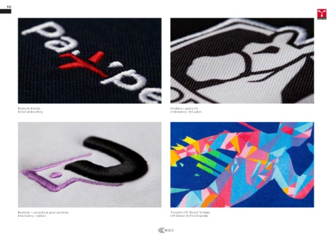 512 Broderie directe. Broderie + patch HD. Direct embroidery. Embroidery + HD patch. Broderie + caoutchouc pour broderie. Transfert DTF (Direct To Film). Embroidery + rubber. DTF (Direct To Film) transfer. INDEX