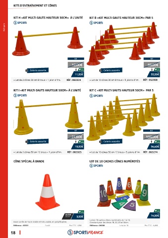 • Lot de 2 cônes 30 cm 8 trous + 1 jalon d’1m. RÉF : 063324 • Lot de 10 cônes 30 cm 8 trous + 5 jalons d’1m. RÉF : 062998