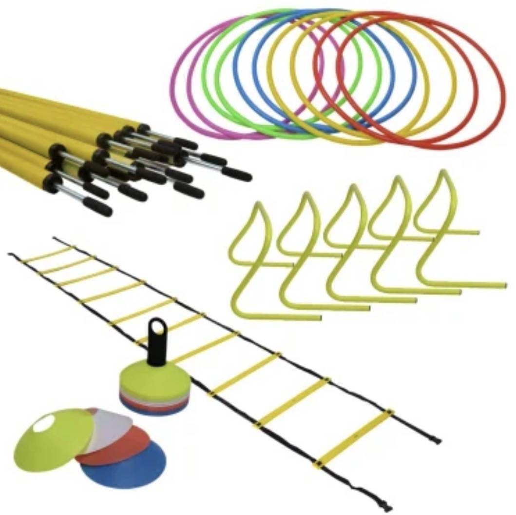 - 1 lot de 40 multimarqueurs - 10 cerceaux ronds diamètre 65cm. - 12 piquets de slalom 160cm. pointe acier - 1 échelle de rythme simple de 4m. - 5 haies de vélocité hauteur 30 cm